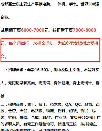 有意思的是,在富士康成都廠區的相關宣傳頁面,除了最被關註的錢外,一段話被加粗、套紅、放大,「每個月舉行一次相親活動,為單身男女提供戀愛機會。」