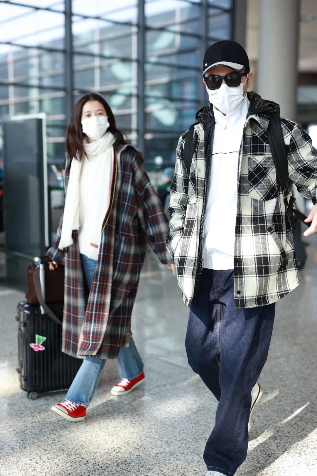 第二對CP袁詠儀&張智霖也是老熟人啦!兩人搭配的是同款格紋情侶裝,青春洋溢的學生感直接拉滿!袁詠儀格紋大衣搭白圍巾,紅色系帶鞋超活力,張智霖黑白格紋夾克配上棒球帽,也是不一樣的休閒有致。他們how pay我好愛!