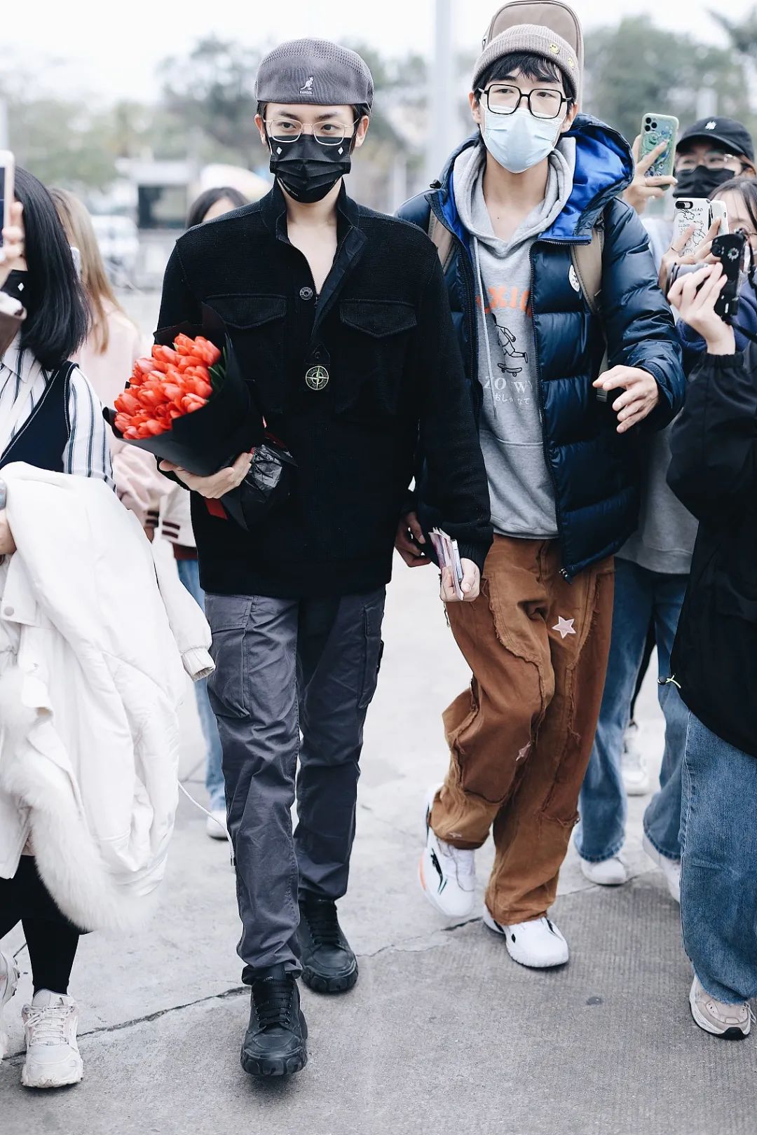 很喜歡把瀏海掀起來露出眉眼的侯明昊呢~這身黑色拉鏈衫搭配灰色工裝褲,灰色貝雷帽就是很適合他的點睛之筆,就是這個敞開的領口看得人不禁打了個寒噤哈哈。