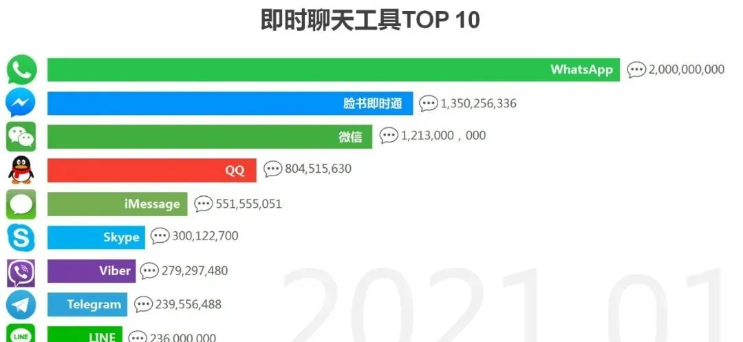 截至2021年7月,基於月活用戶數據,全球最受歡迎的即時聊天APP分別是: