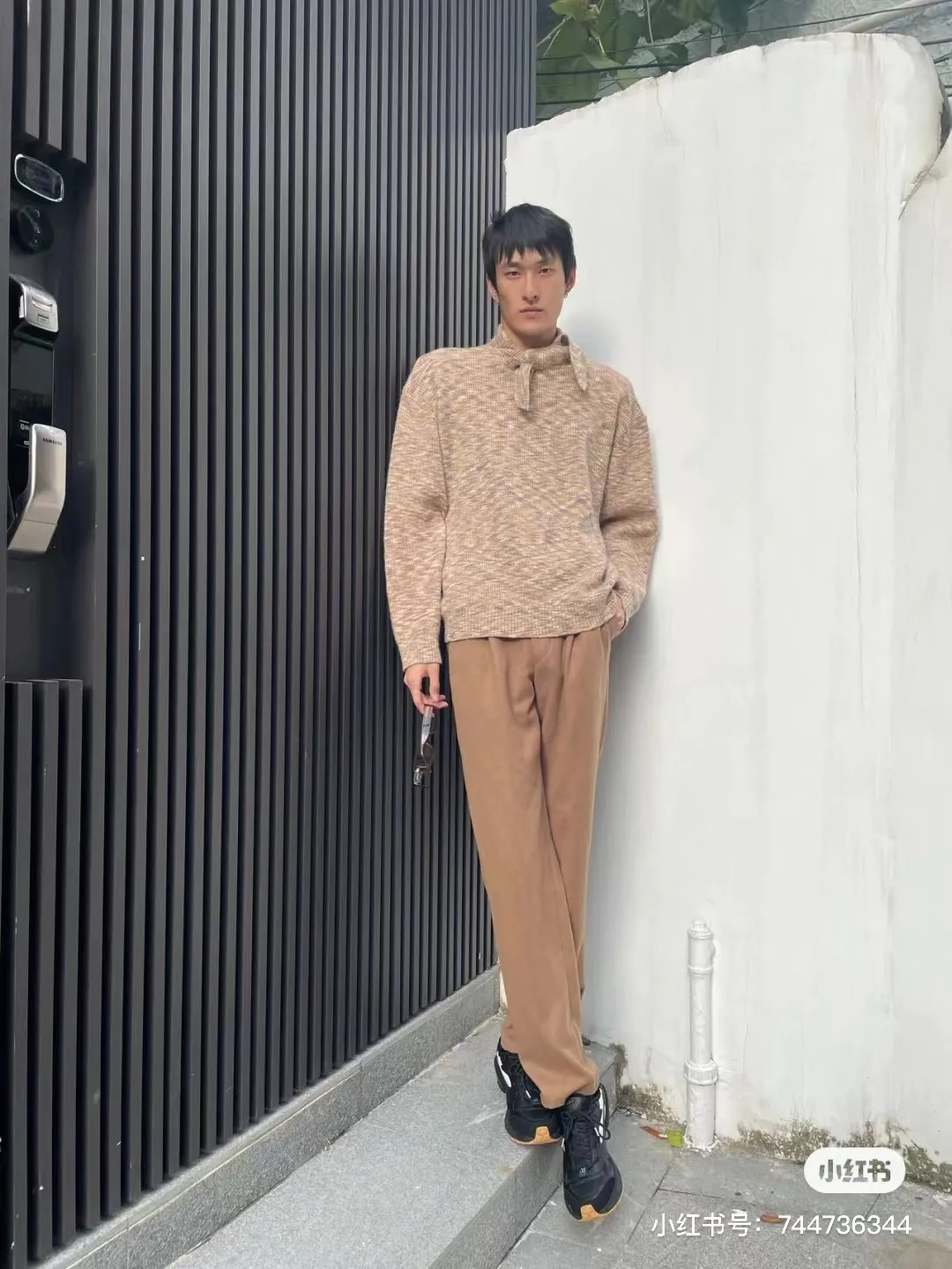 卡其穿搭上衣淺卡其或者淺棕色的毛衣,瘦一點的朋友最好上面有點橫向的紋理,視覺上更寬厚一點;褲子要比上衣略深,最後黑色鞋收尾,基礎優雅男式秋冬穿搭。