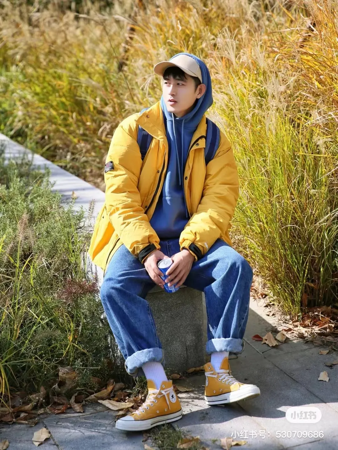 再來個用亮色系服裝的陽光男孩路線作Example。藍色連帽衛衣搭配閃電黃工裝棉服,經典藍色牛仔褲保持藍色衛衣的視覺連貫性,最後踏一雙落葉黃帆布鞋收尾,首尾黃色系,內搭藍色系,首尾同色還能玩出層次感。