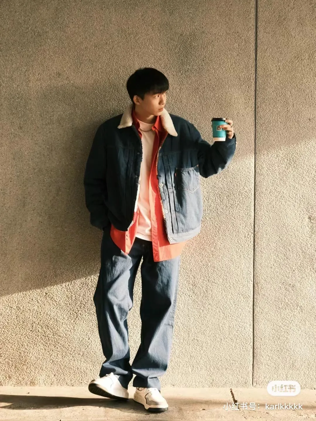 「自古紅藍出CP」,秋冬最有少年感的搭配。羊羔絨領毛衣做內搭,紅色襯衫敞開披上,褲子和外搭全部一套牛仔Style,這對比色Slay全場。