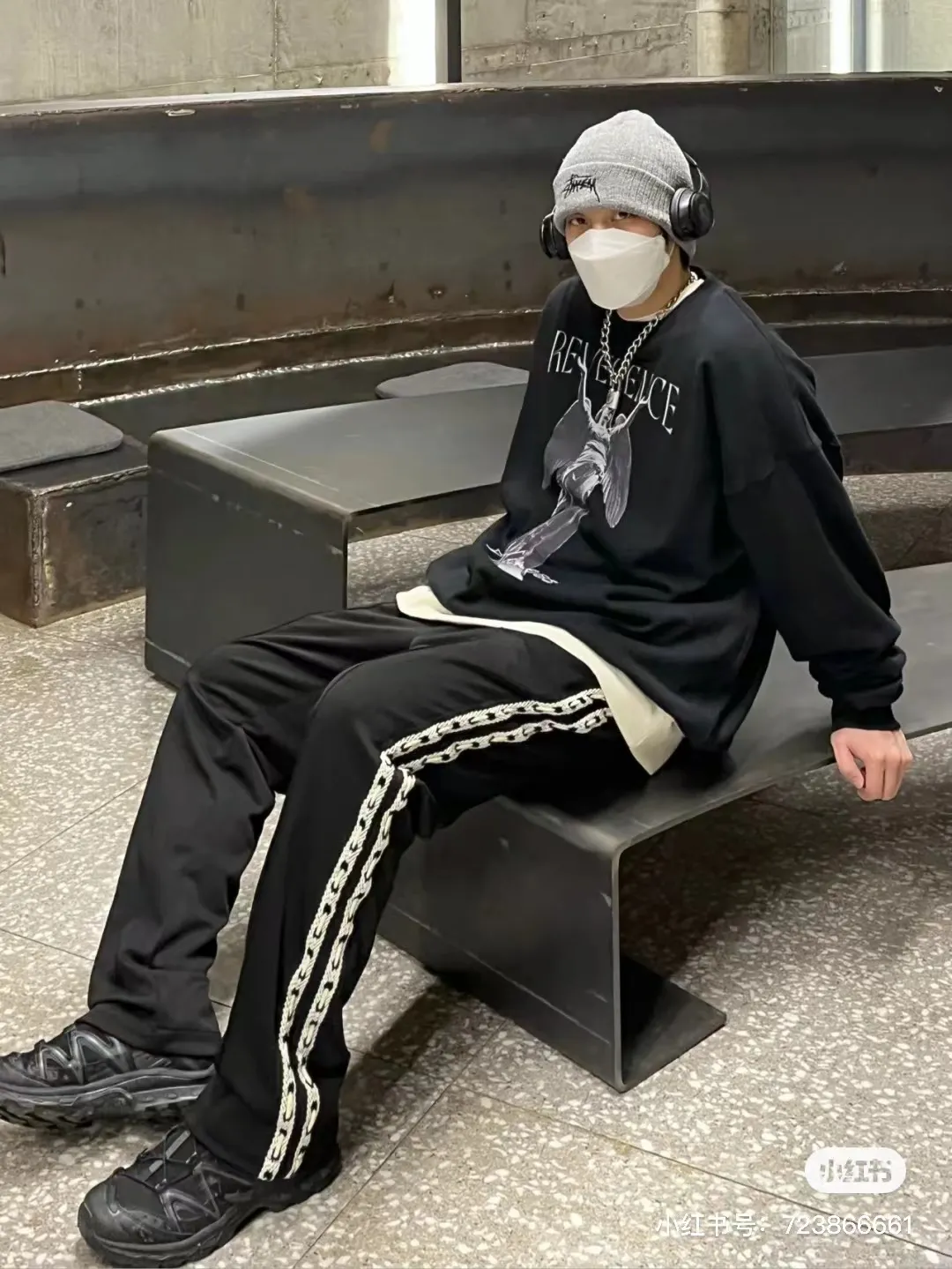 給各位來個優秀范例,經典的首尾同色色調,黑色搭配推薦給懶得挑衣服的男士們。秋季經典黑色Hoodie上身,外搭卡其色馬甲,下裝來一條略寬鬆的深灰Oversize,最後腳上一雙深灰低幫,再戴一頂百搭黑色平簷帽,秋日最City穿搭直接拿捏。