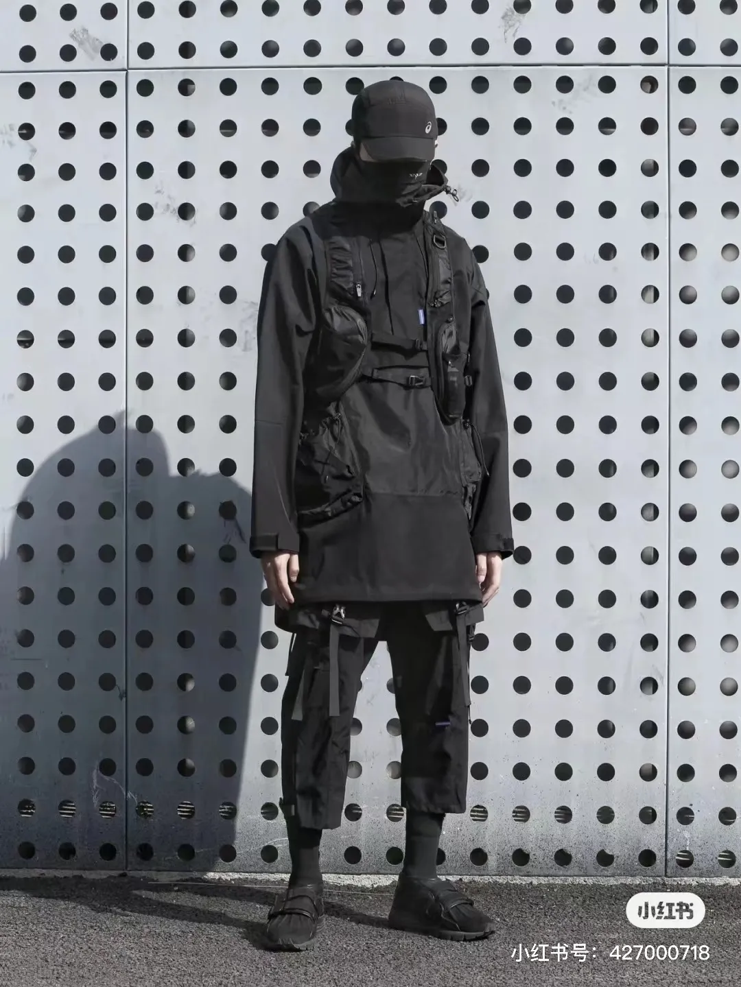 走暗黑機能風,重點就是一身純黑。機能風夾克,或者機能風外套,讓多得數不過來的口袋和搭扣顯出層次感;下裝純黑九分褲,黑色長襪,,再來上一雙中高幫板鞋,未來感十足。