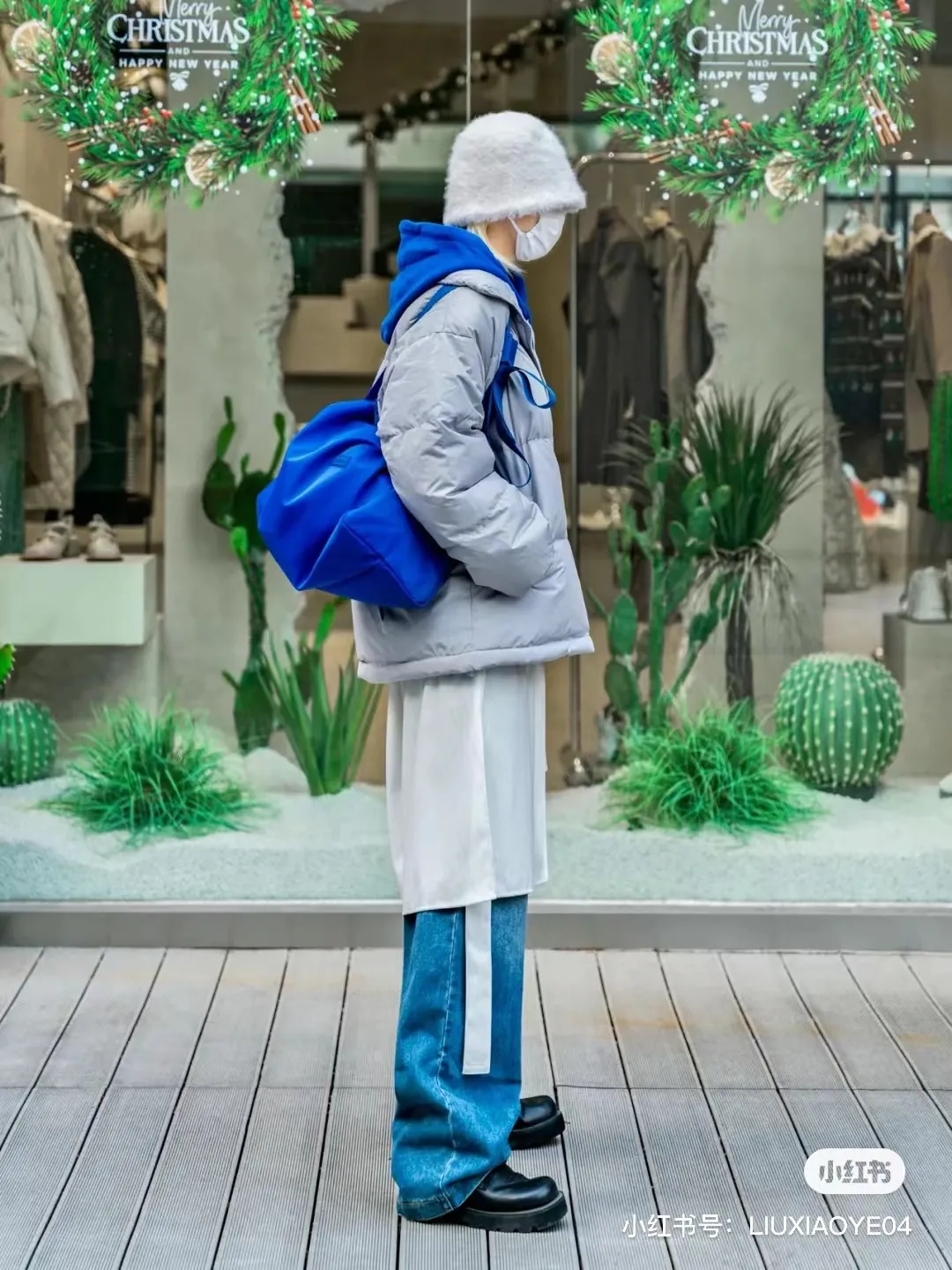 進階一點,可以開始「著色」了。內搭克萊因藍衛衣,下配寬腿藍色牛仔褲,外搭一件淺灰棉服,戴一頂純白毛線帽,平平無奇也能穿出韓系男友風。