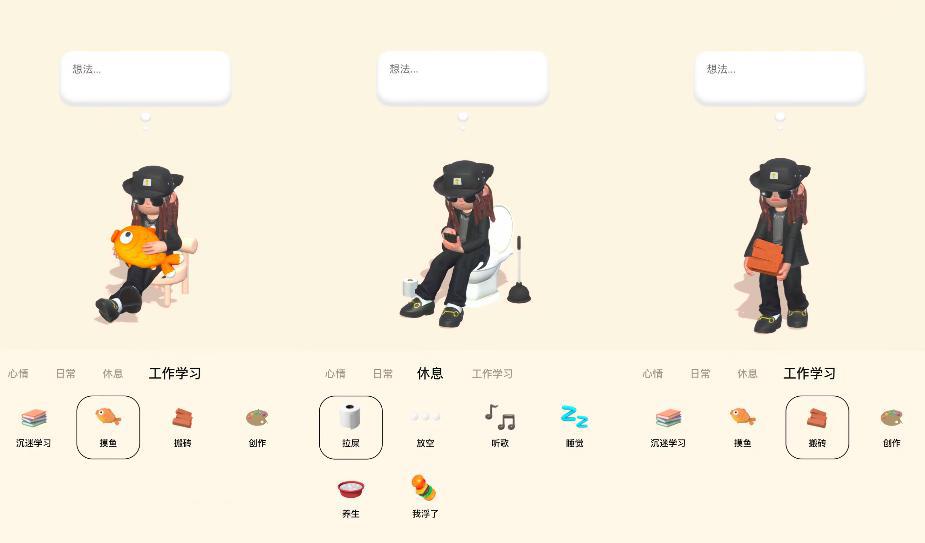 在打造完屬於自己的形象後,用戶可以在裡面設置自己的「心情、日常、休息、工作」四類狀態,例如,用戶可以選擇「躺著追劇、在線聽歌、無聊的摸魚、辛苦的搬磚」等一系列動作,每個想法都有對應的動作場景展示在廣場主頁中。
