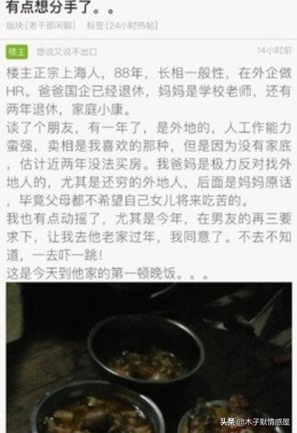 po文的女生自稱27歲,來自小康家庭,跟江西農村出生的男朋友相處了一年,感覺還不錯。父母一直反對他們在一起,她也有些猶豫,可最終還是對男友不舍,於是兩人繼續交往。