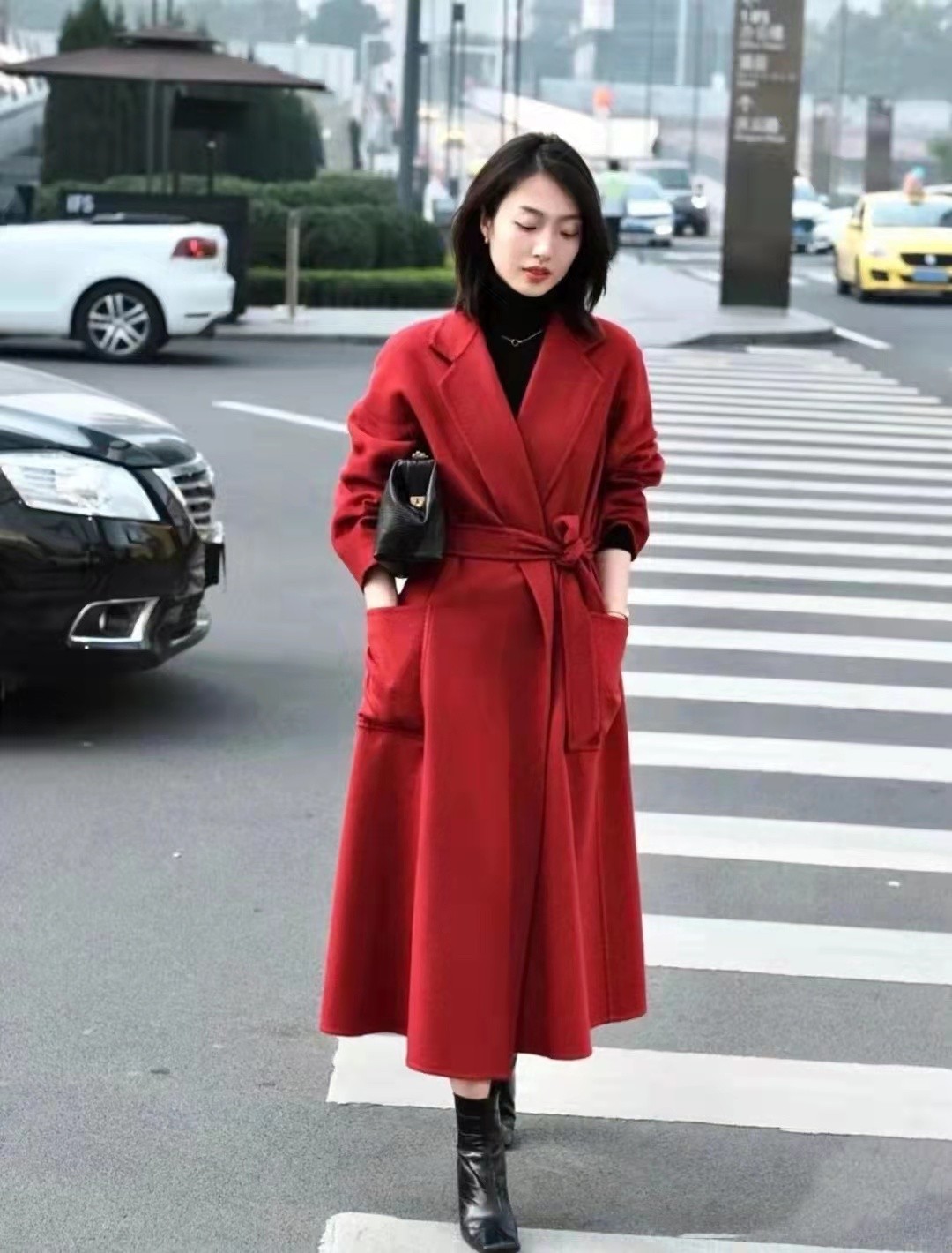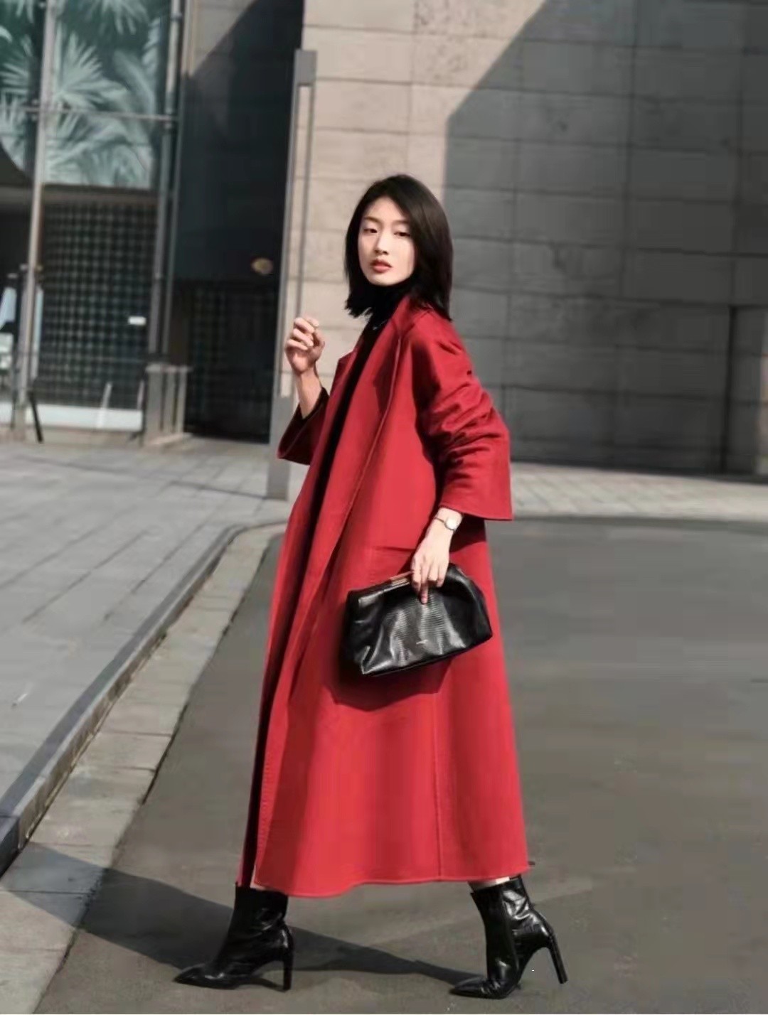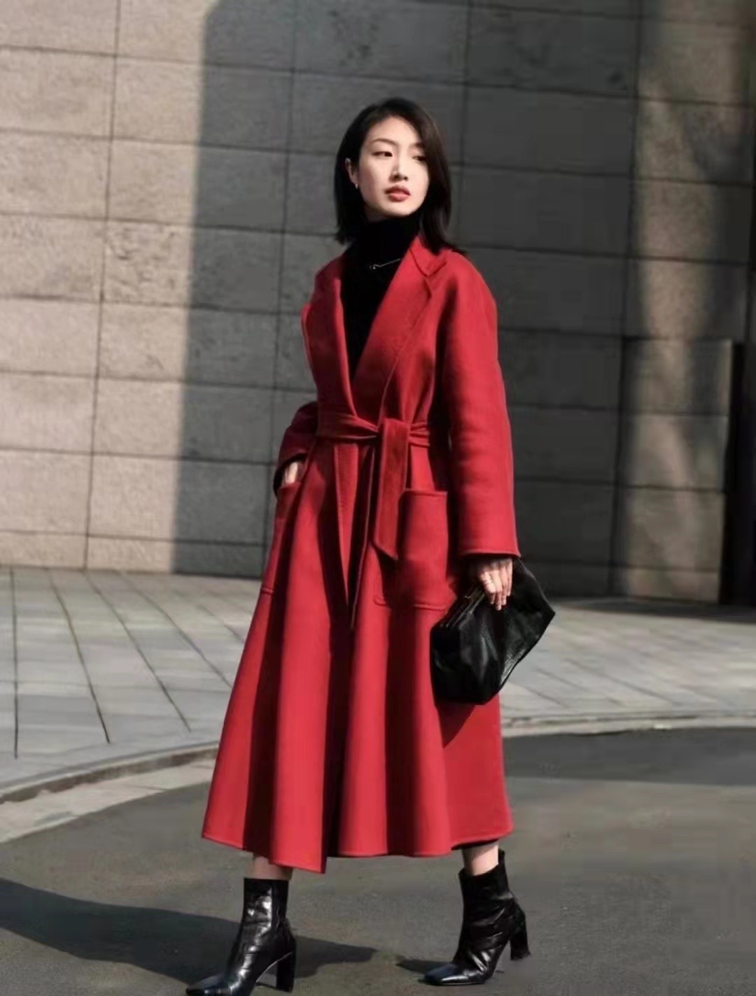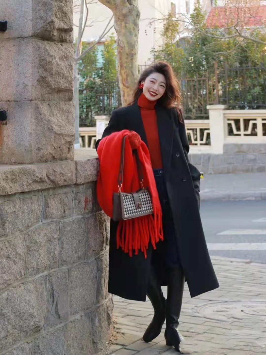 紅色基礎款大衣+黑色內襯+大長靴