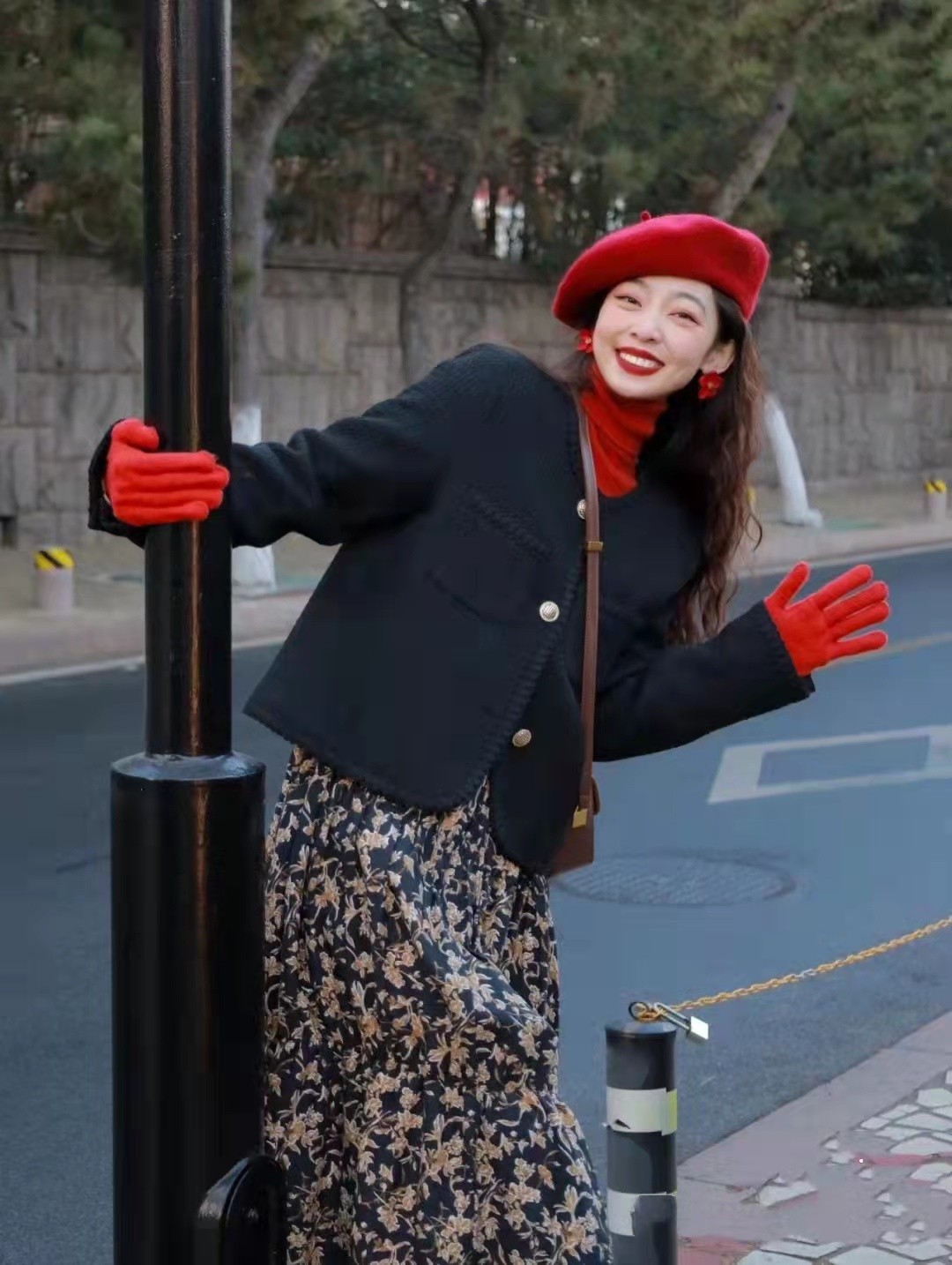 強調用紅色的色彩,但並不代表沒有別的選擇,像博主這次只是戴著紅色的帽子,戴著紅色的手套,裡面穿著紅色毛衣,給人的印象依然很好。