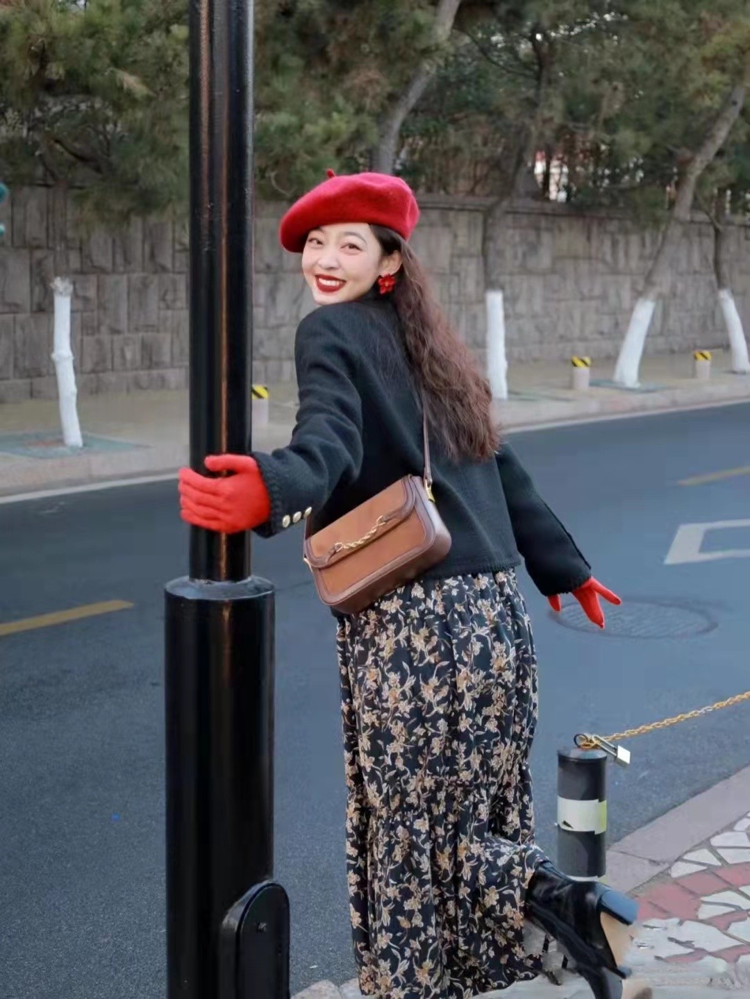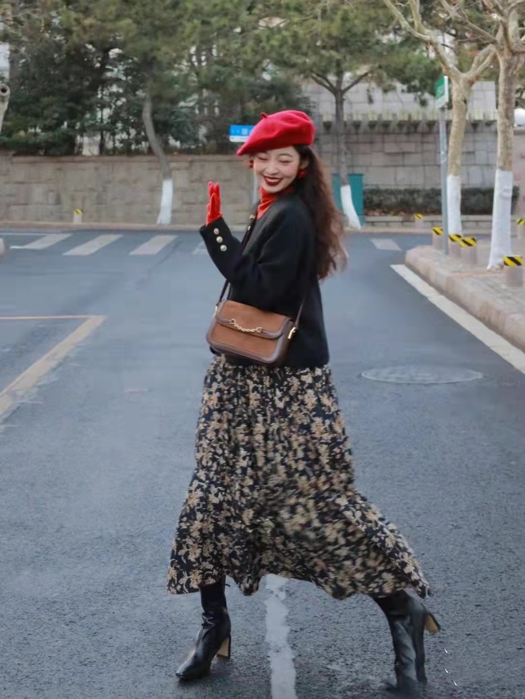 雖然是簡單地穿著,但是造型上挺受歡迎,無論是紅色帽子、手套,下面穿黑色的靴子,在新年時節挺受大家的歡迎。這種豐富的視覺色彩,時髦度足夠強,沒有那種單調的氣息。