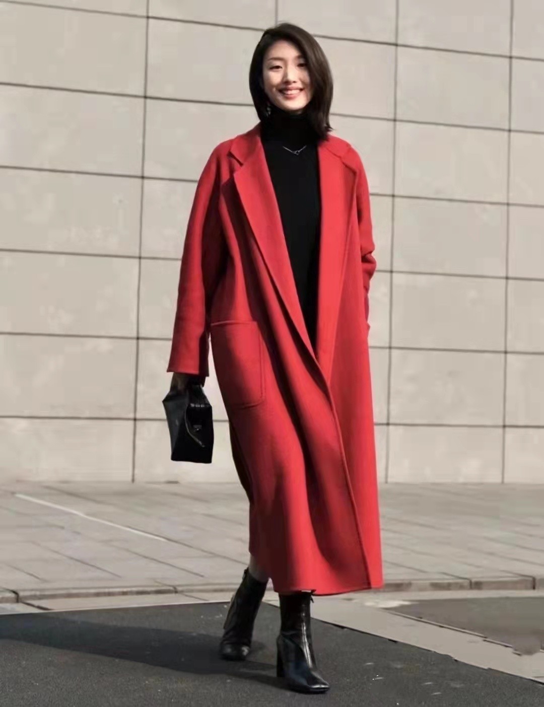 這件紅色的基礎款大衣,在新年時節那是很常見的,顏色上看著非常的喜氣。關鍵是還能夠有很強的時尚感,適合這個時間段,真的很合適。