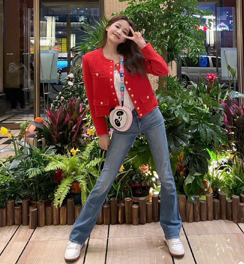 Celine的紅色粗呢外套搭配微喇牛仔褲秀出大長腿,冰墩墩斜挎包為造型增添幾分可愛~