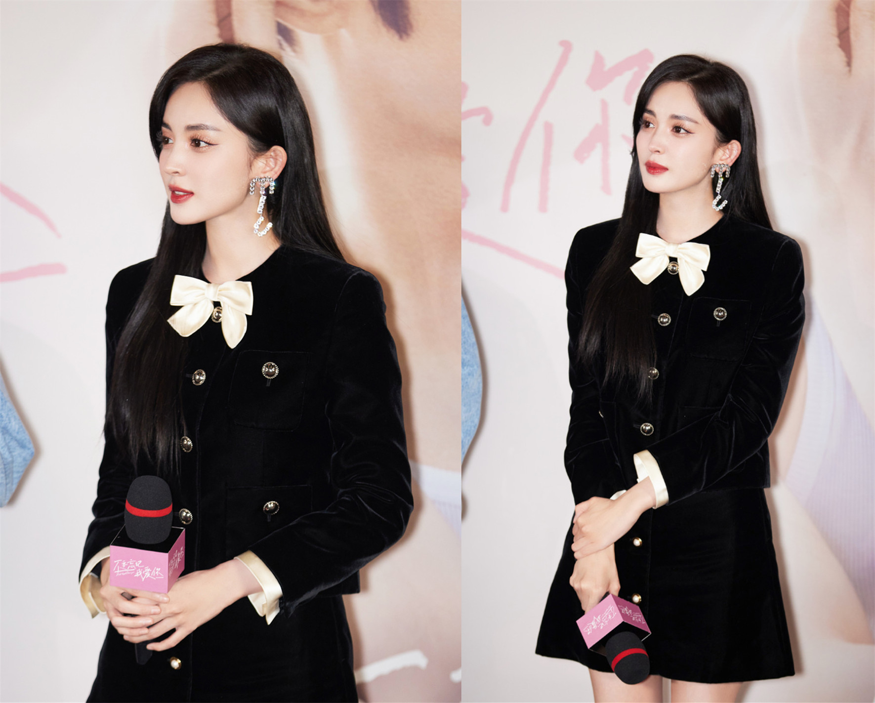 粉色連衣裙是溫柔小女生,紅裙寓意紅紅火火,第三套造型則是甜美少女。選了一套miumiu的貴氣名媛風格的黑色套裝裙,這套造型也很漂亮很大小姐,甜美貴氣,也相對比較保暖。