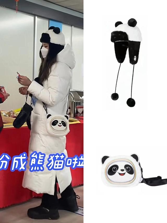 谷愛凌在奧運村的私服穿搭都來自代言品牌安踏,白色長款羽絨服保暖,加上貓熊配色的冰墩墩雷鋒帽和斜挎包,這一套保暖又可愛~