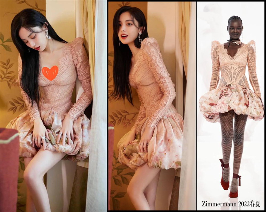 但娜紮根據場合換了三套不同風格的造型。線上直播採訪活動,娜紮選了一套來自zimmermann 2022春夏系列的粉色連衣裙亮相,這套粉色蕾絲裙很挑人,需要皮膚白皙身材纖瘦但有不能過於紙片才能穿好,有顏有身材的娜紮自然也是輕鬆駕馭,領口也沒有做過多處理,落落大方~