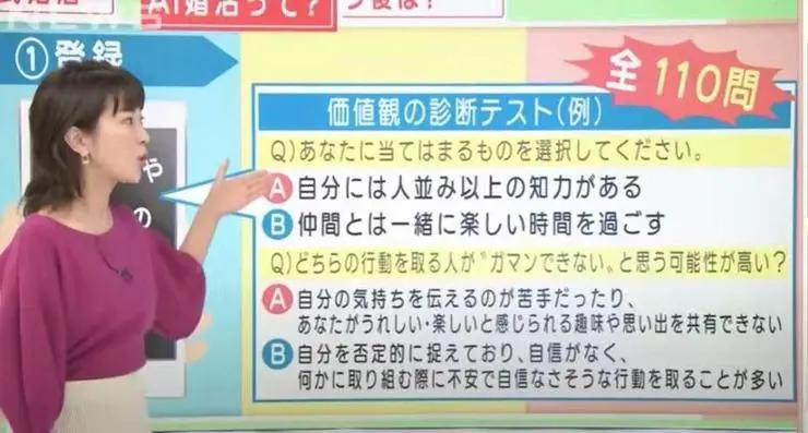 相比於長相、學歷、收入等外在條件之外,在AI婚配系統中,AI還會針對使用者的價值觀進行詢問。例如,根據日本一檔節目報導,使用者會經常被問到這樣的問題,「以下哪個選項更符合你的期望:A能擁有超越常人的智力;B能夠朋友一起度過快樂時光」。