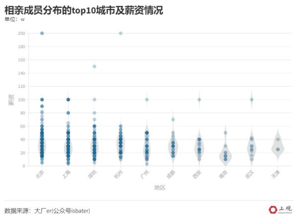 在薪資水準上,不同城市的大廠人薪資均呈現橄欖球狀分布。薪資在20w-40w之間的人數最多,最高薪資達到200w。