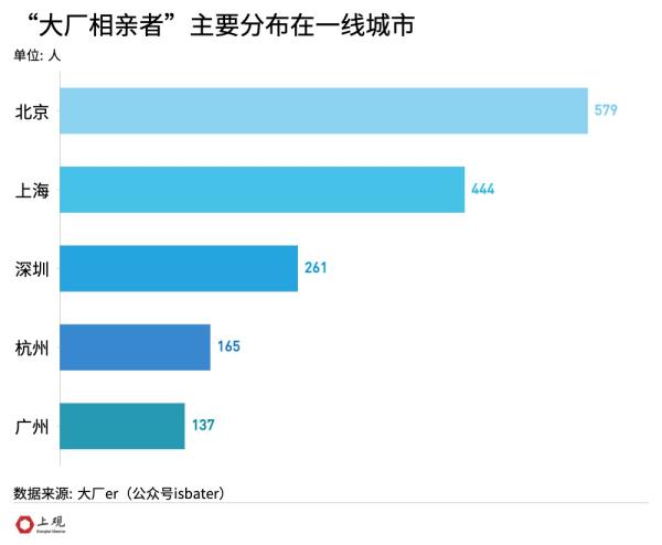 這些”大廠”員工主要分布在北上廣深等一線城市,其中北京的數量最多,達到579人;其次是上海與深圳。