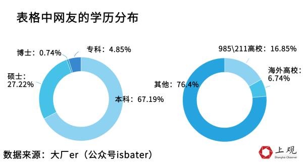 在2446個交友名單中,有大約1300人填寫了自己的學歷。本科學歷的占比超過一半,碩士學歷的占比也接近30%。並且,據不完全統計,有16.85%的用戶畢業於「985」或「211」高校,6.74%的用戶畢業於海外高校。