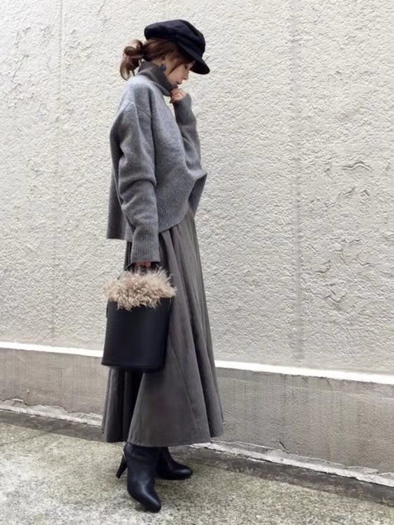 要想把同色系的搭配穿出優雅與淑女的感覺,首選就是半裙搭配了,像這一套利用灰色高領毛衣配上高腰半身裙的造型,清新溫婉,渾身上下都散發出高級與大氣魅力,黑色的報童帽為造型增添了一絲個性感,低調又不顯張揚。