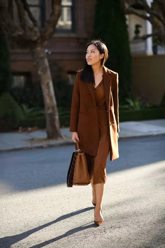 大地色系的搭配一直都自帶復古感,利用中長款式的棕色西服,配上同色系的緞面連衣裙,精緻當中又不乏女生味,走起路來都散發出優雅魅力。