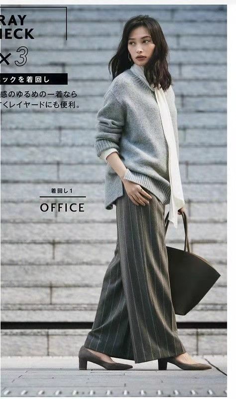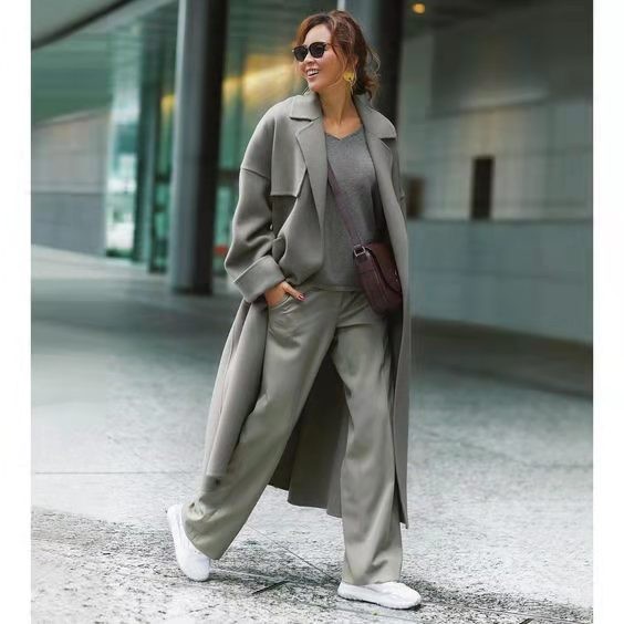 淺灰色的呢子大衣,採用了寬大的翻領設計,再結合上具有垂感的面料,穿上身給人一種大氣又顯氣爽的感覺,內搭選擇灰色針織衫以及灰色西服闊腿褲,三種相同色系的單品搭配在一起,絲毫沒有平庸感,反而層次十足,女生走起路來,身上充滿了颯爽的魅力。