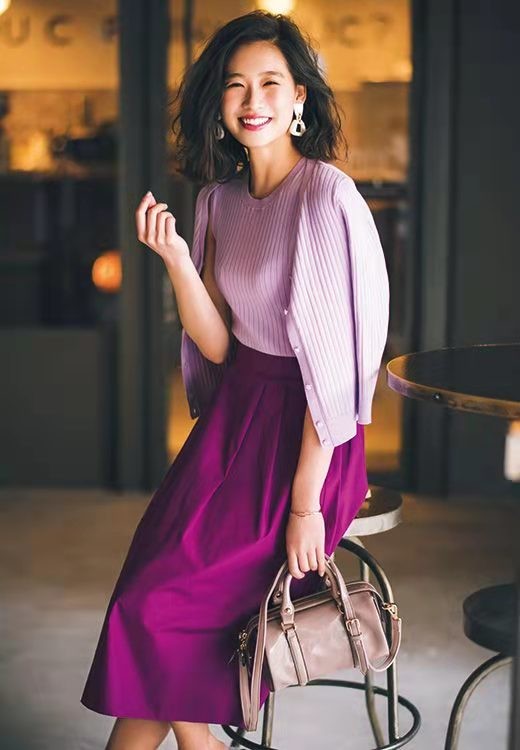 除了黑白灰色系的搭配之外,清新又顯淑女的紫色同色系搭配也在時尚圈當中占有一定的地位,其實受到了眾多成熟女性的追捧,利用淺紫色的針織開衫配上深紫色高腰半身裙,完美的彰顯出了成熟女性身上的優雅與溫柔感。