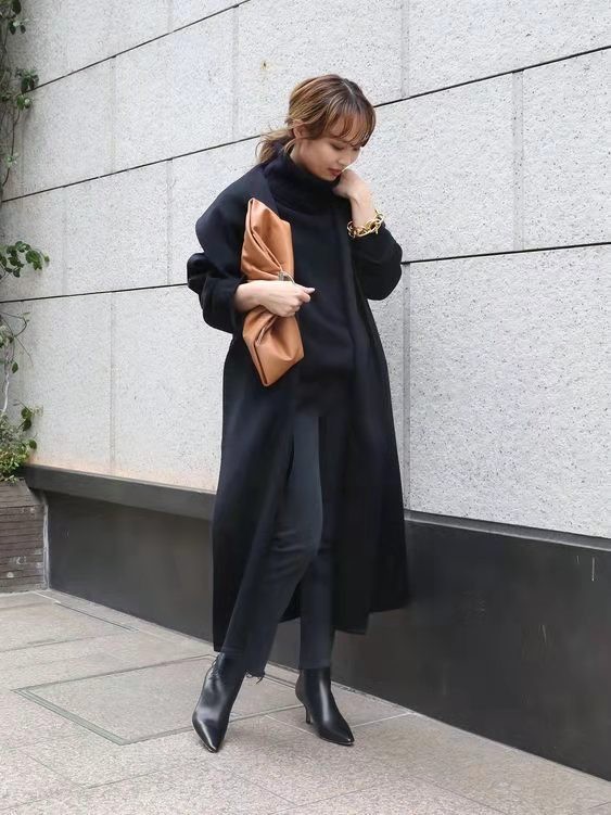 如果想要一身黑色系的造型之下,不顯沉悶疲乏,此時可以應用一些其他色彩的小配飾進行點綴,像下面這身大衣搭配當中,就選擇了一款棕色皮質手提包進行搭配,大氣又高級。
