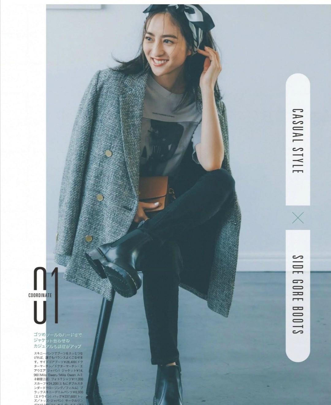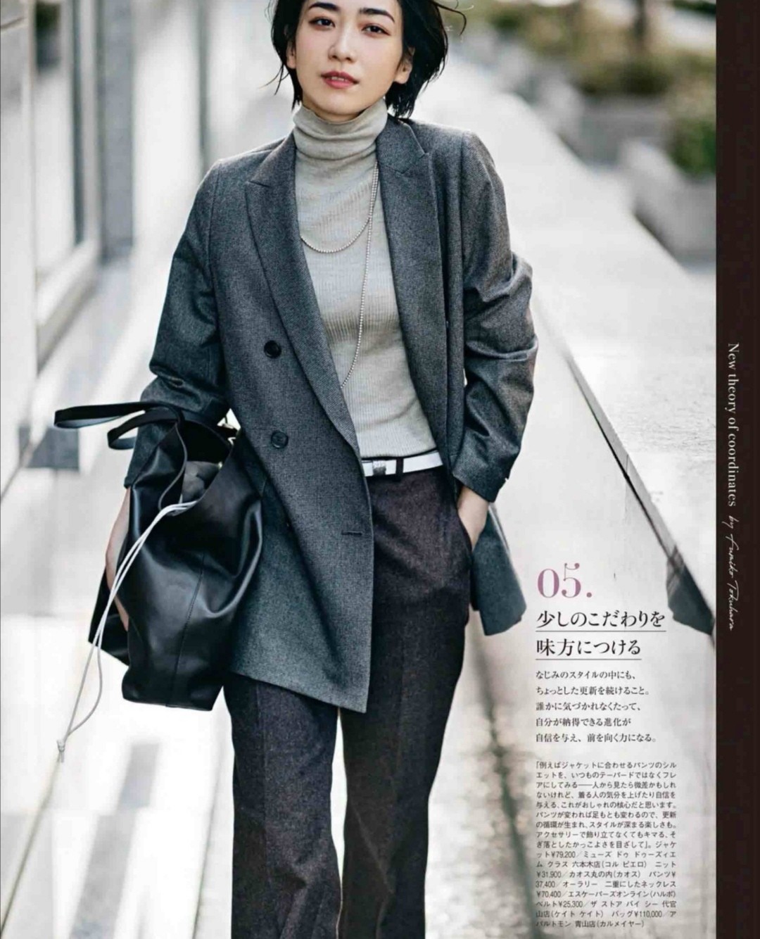 相信很多四十歲以上的女性會被這一組穿搭圈粉,顏色一點都不誇張,不會難掌控,深灰色的小西裝營造出成熟幹練的感覺,內搭的是淺灰色的高領衫,它的材質修身,能稍微的透露出身材輪廓,展現出滿滿的簡約感。