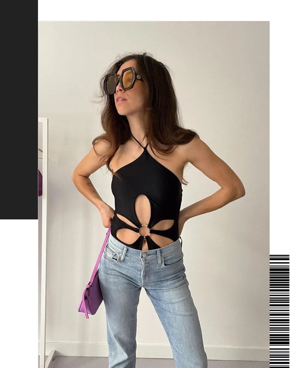 緊身花朵形狀鏤空上衣搭配牛仔褲,帥氣和性感中和得恰到好處。