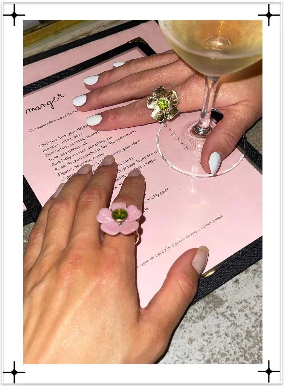 花花的戒指搭配美甲,讓春天在指尖綻放。可以選擇立體感強一點的小花造型,更顯精緻。