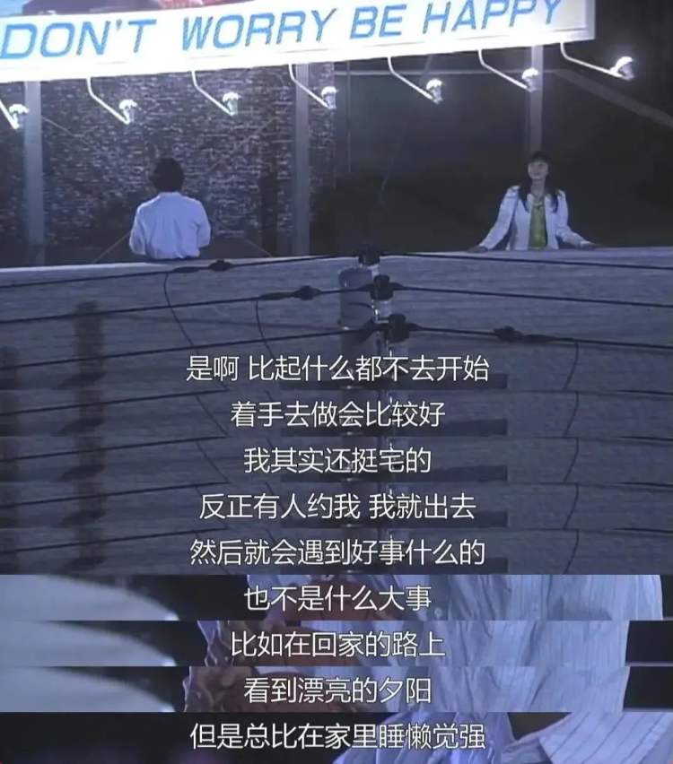 山口智子扮演的被逃婚、失業又沒存款的葉山南遇上失意落魄的鋼琴家瀨名,彼此都是實實在在的打工人,戲裡沒有華麗的金手指,有的只是無數生活的窘迫,他們在人生低谷相遇,有相見不歡的吵鬧,當然也有相互慰藉的感動。特別是樓頂的「Don’t worry,Be happy」廣告牌,簡直就是全劇最浪漫的告白。