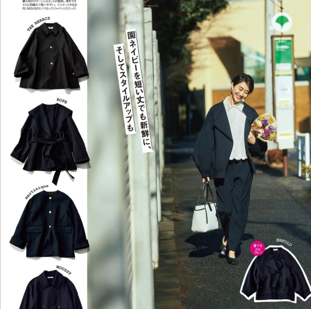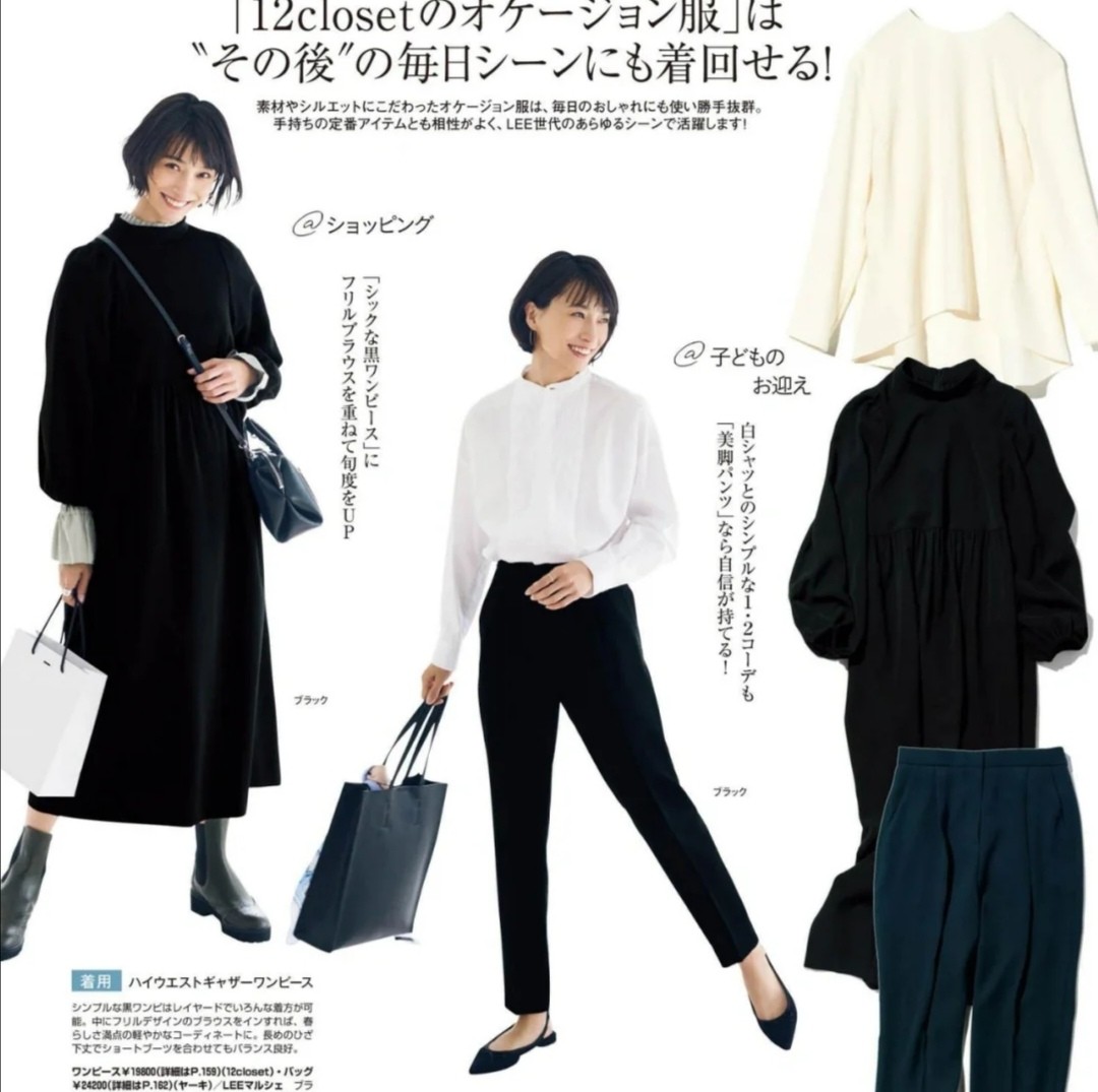 在大面積的黑色之中,加入白色襯衫的點綴,可以有效地化解本身黑色存在的壓抑的感覺,而黑色具備對身材的極致的優化作用,很符合中年女性的穿衣口味。