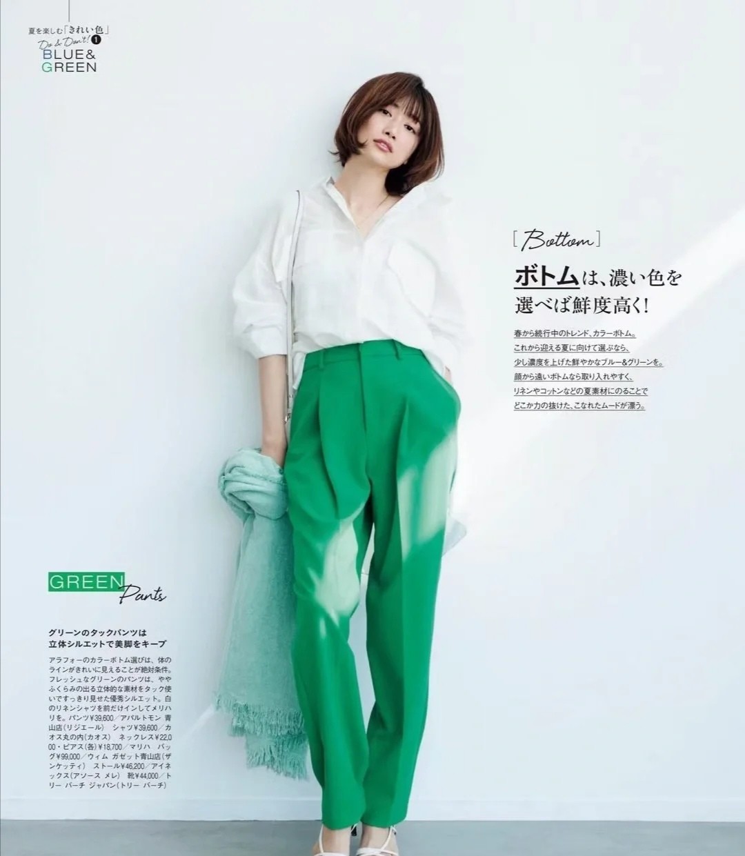 像這件白色襯衫,它是很經典的一大設計,把領口稍微解開,營造出小V領的效果,可以修飾頸部線條,配合綠色長褲這種充滿了生機感的色系,與白色單品的配合碰撞出了清新的視覺畫面。