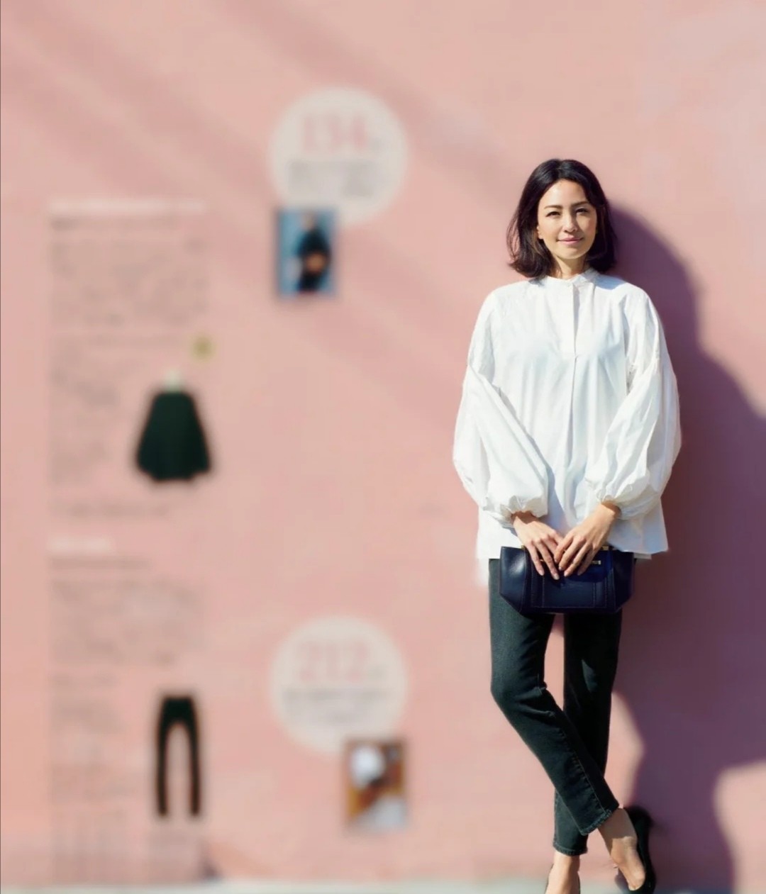 像這件白色襯衫,它也是相當經典的一類單品,四五十歲以上的女性,穿上它完全不會顯得違和,反而有一種隨性感。袖口的設計稍微寬鬆一些,燈籠袖的元素加強了隨意感的釋放,也能避免穿出緊繃的狀態,盡量地讓女性保持舒展的風格。