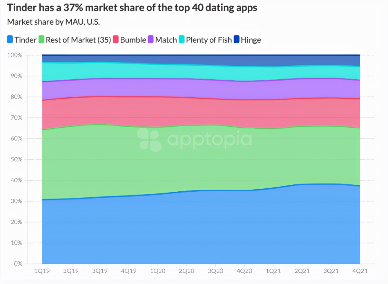 最後 Apptopia 還發現,如果單獨對美國市場中排名前 40 的交友 App 進行統計,那麼「Tinder」將以 37% 的市場份額穩居頭部地位,其月活用戶數量比除去「Bumble」、「Match」、「Plenty of Fish」和「Hinge」之外的其餘 35 款 App 還要多。「Bumble」則以 14% 的市場份額位居第二。