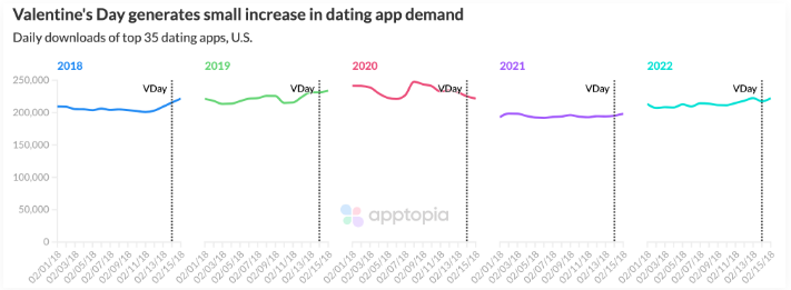 2018-2022 年間,美國市場中交友類 App 在情人節前後的單日下載量變化 | 數據來源:Apptopia