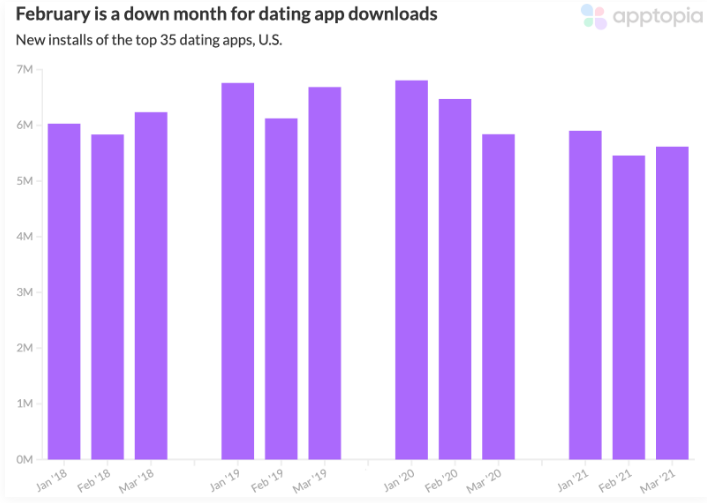 在傳統觀點看來,2 月 14 日的情人節必然會帶動西方市場對交友類 App 的需求,從而讓下載量大幅上漲。不過 Apptopia 的總結數據則顯示,情人節往往只會讓美國市場中的交友 App 下載量小幅上漲;實際上,美國市場中交友 App 在 2 月的下載總量甚至往往低於 1 月和 3 月水準。