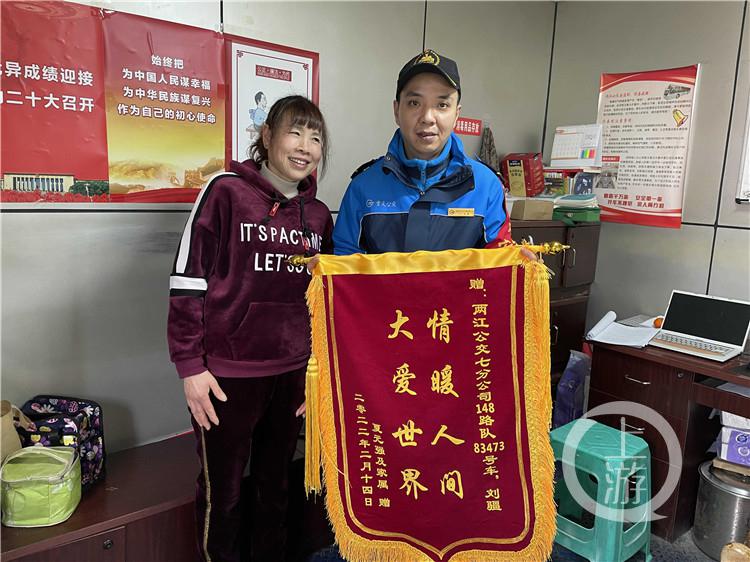 2月14日,家住渝北區的毛庭淑,帶著一面趕制的錦旗,來到148公車線路調度室,親手將錦旗交給了148線公車駕駛員劉疆,以感謝他將自己走丟的外孫女冰冰(化名)送回家。毛庭淑連聲說著感謝的話,表達自己的謝意,也希望能借錦旗傳播正能量。