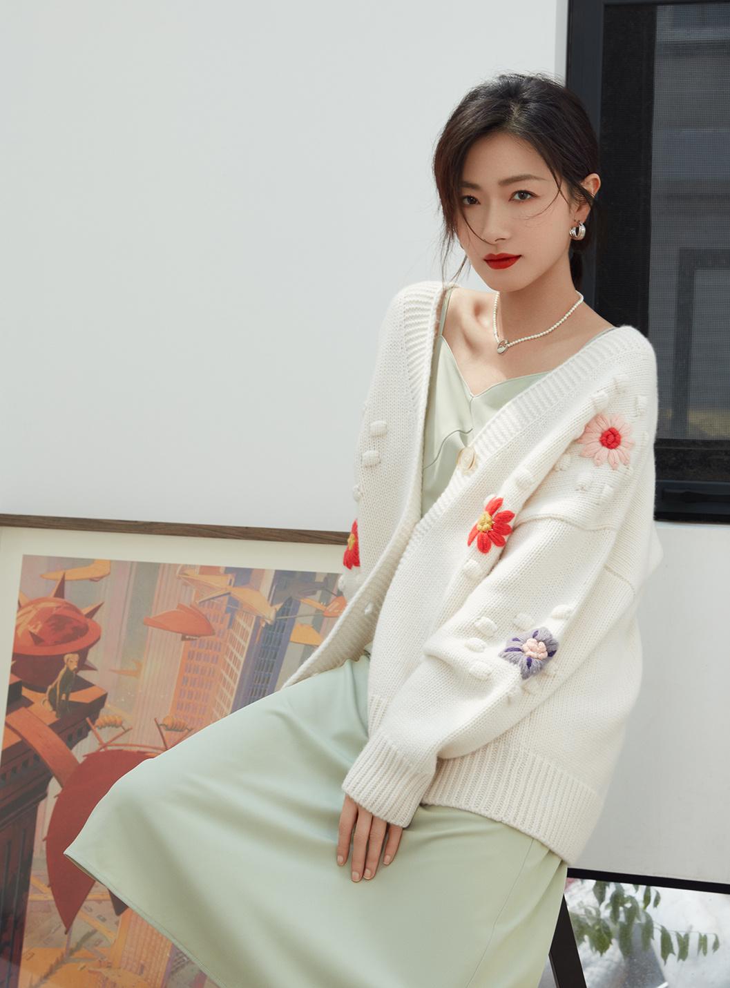 江南女生的穿搭也更溫柔韓系,這個季節露肩上衣和各種吊帶抹胸是出鏡最多的單品。萬茜演繹剛柔並濟,鉤花針織搭配淡綠色真絲吊帶裙。穿搭完美平衡柔美與幹練,性感甜欲誰會不愛。