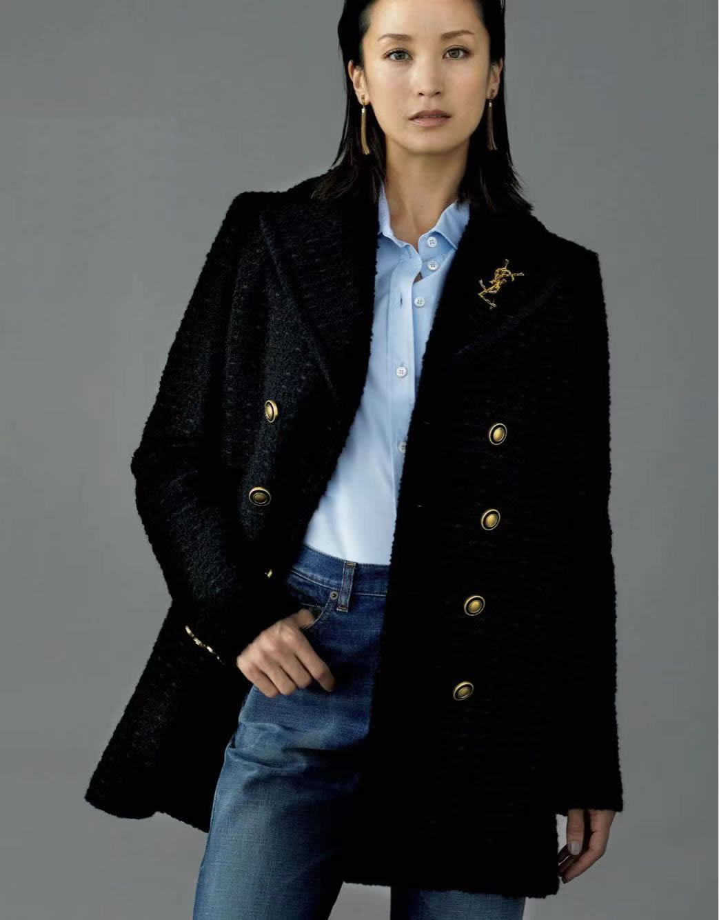 黑色衣服最常見的五金紐扣色,以大顆大顆飽滿的銅扣點綴為最多。兩者互相追捧,相得益彰,表達著濃重的輕奢宣言。