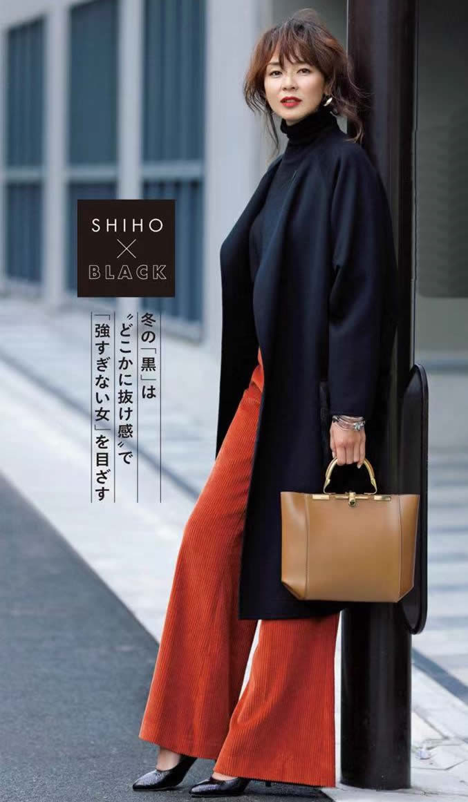 黑色大衣內搭同色小高領的嫻靜內斂,卻被一條橘紅色闊腿褲的熱情所感染,瞬間迸發的暖意活力,在蕭瑟中分外有力量。
