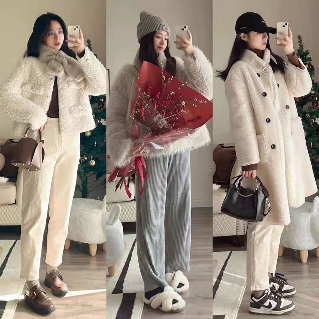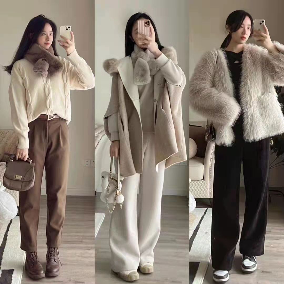 短款的淺棕色上衣搭配深藍色的牛仔褲和老爹鞋,是體現少女氣息的絕佳選擇。淺色系的毛絨中長款大衣,搭配墨綠色的哈倫下裝和棕色小皮鞋。
