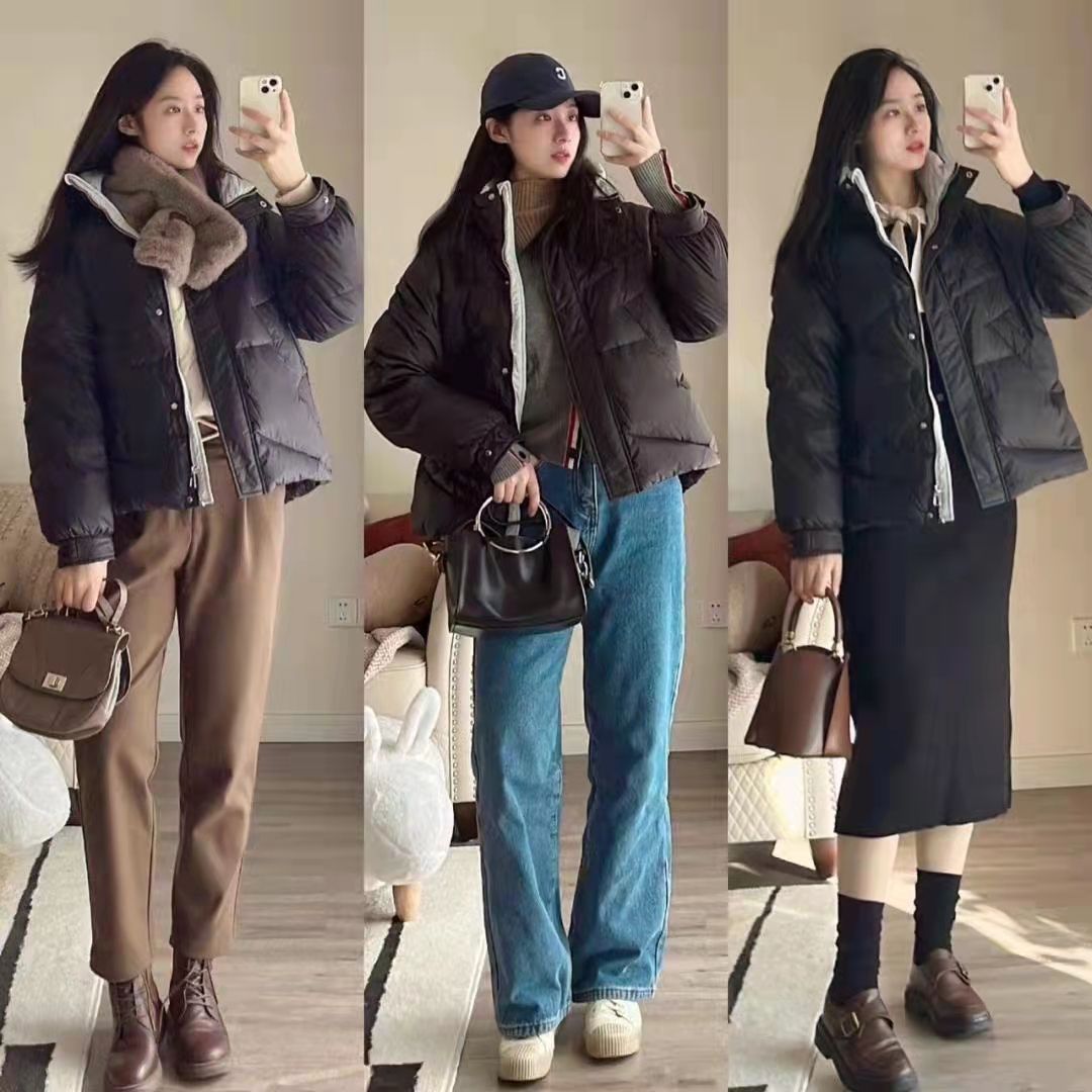 較短的黑色棉服上衣就非常適合一些小個子女性朋友們選擇,不論是搭配棕色的褲子還是牛仔長褲,都能夠打造出青春靚麗的感覺。