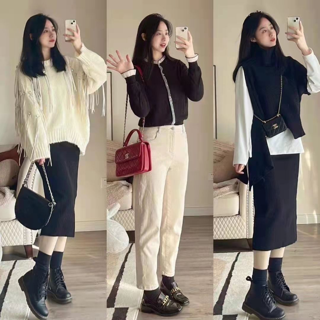 兩件套的黑色針織衣也是特別適合打造一種溫柔的淑女感,黑色的針織上衣與白色打底疊穿起來給人在視覺上帶來了滿滿的層次感,整體看起來也十分落落大方。黑色的裙子和針織上衣在視覺上還能起到顯瘦顯高的作用。