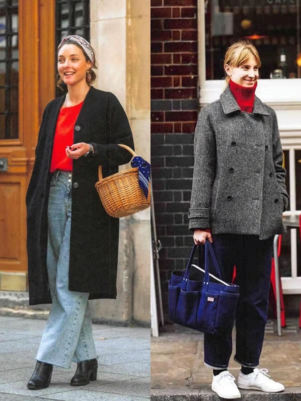 像這裡的紅色毛衣,搭配黑色大衣、牛仔褲與粗跟短靴,基礎款也可以令人驚艷。
