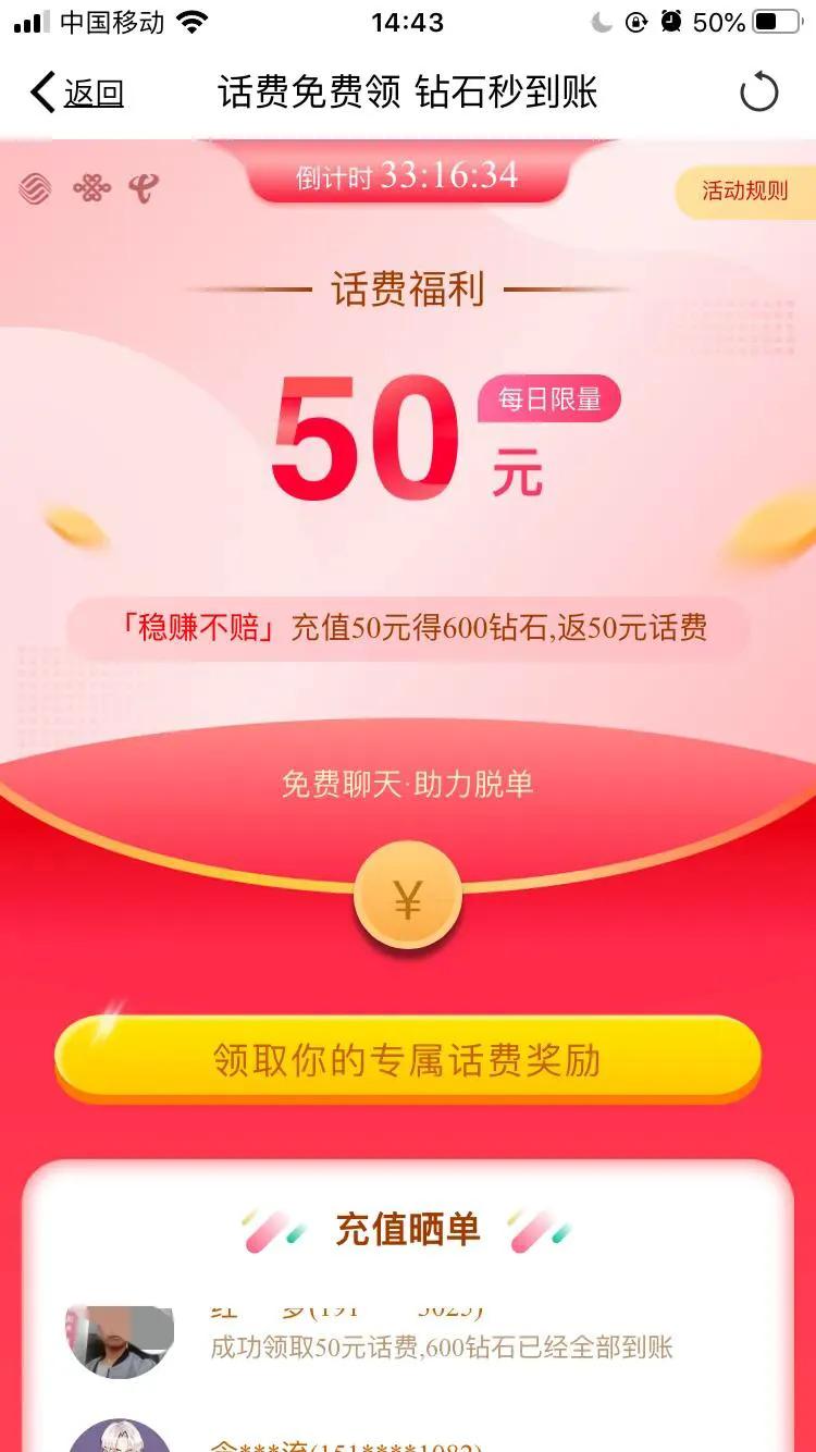 廣告裡面說的充值買聊天磚石送手機費也是真的嗎?是的,沖滿50送50手機費,分五期返還,一期10元。看是不虧的感覺,這就是平臺的另一個誘餌,只要你開始聊,聊下去你禁不住誘惑繼續沖的錢遠遠不止50元。