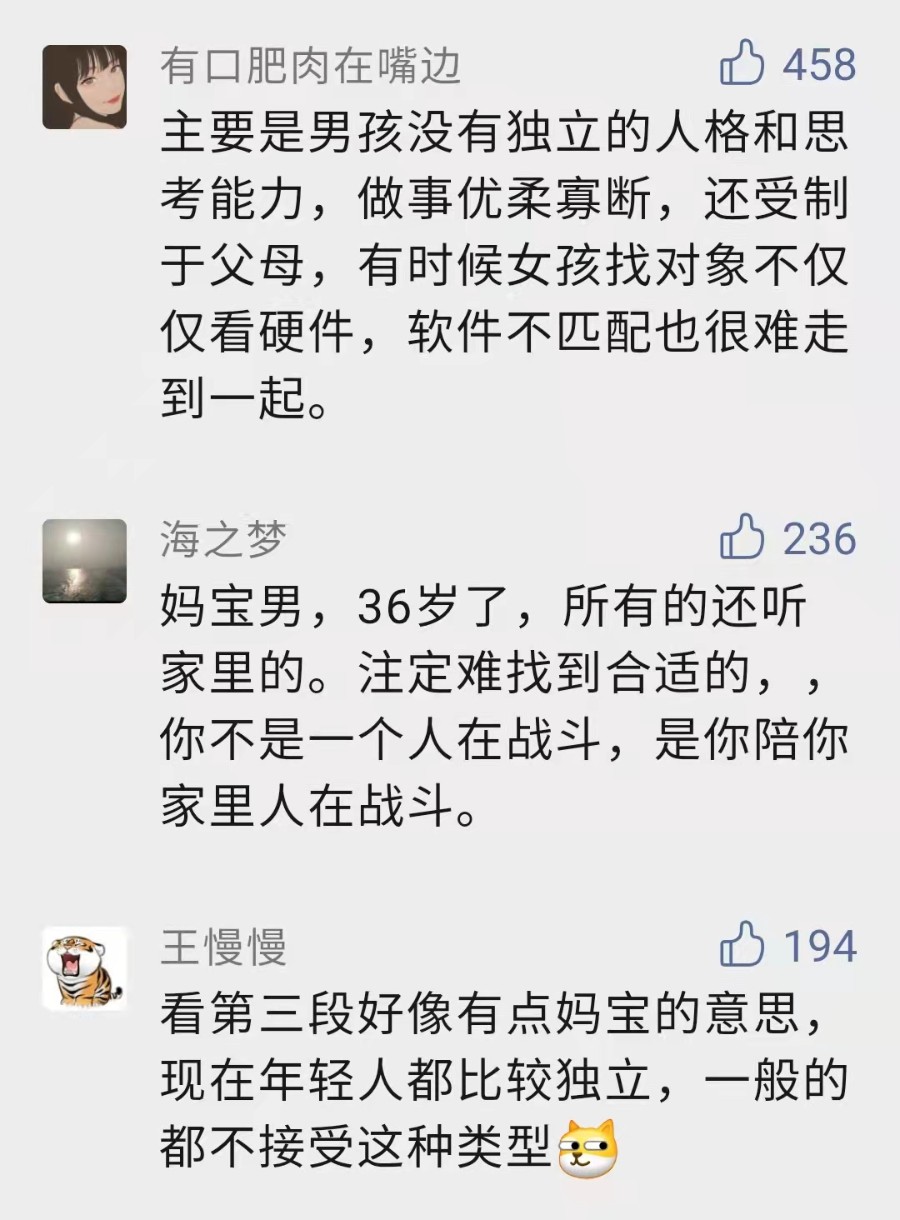 小李說,他很清楚自己本身的問題:作為一個36歲的男人,他太乖了。從小被父母嚴格的約束,他從來都不敢越雷池一步,甚至從小到大的所有決定,都是父母和親戚們共同商量決定的。對家庭的依賴,讓他沒有勇氣獨立去選擇。