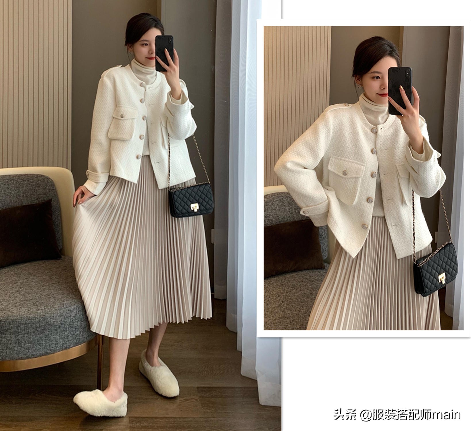 都已經是春天了,放棄沉悶的顏色吧,這件白色小香風外套它不香嗎?內搭高領衫,溫度和風度都有了。